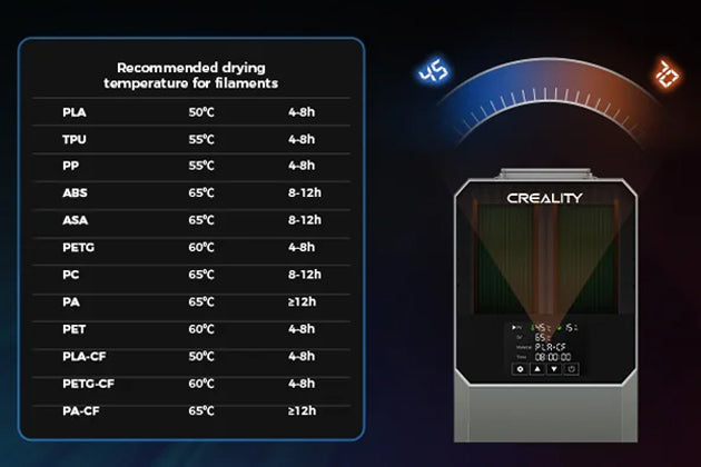 它有針對不同耗材類型的一鍵式溫度設置,支持多達 12種耗材,包括PLA-CF、PETC-CF 等普通和高性能復合材料。 當然,也可在45°C-70°C之間自由調節溫度。
