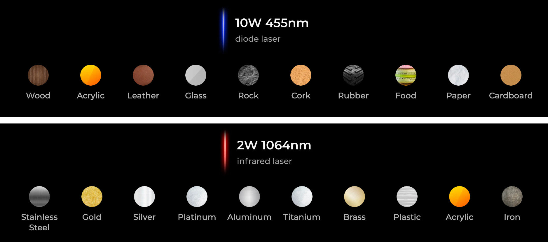 - 藍光雷射:紙張、木材、皮革、MDF、不銹鋼、深色不透明壓克力、竹子、布料、深色玻璃、陶瓷、玉石、大理石、頁岩、水泥、磚、鍍層金屬、塗漆金屬