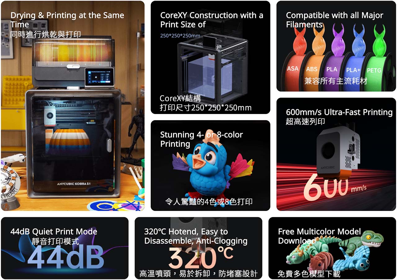 Kobra S1配備金屬熱端,噴嘴尖峰溫度可達320°C,熱床最高溫度可持續維持在120°C,處理ABS、ASA等功能性材料也能輕鬆自如。