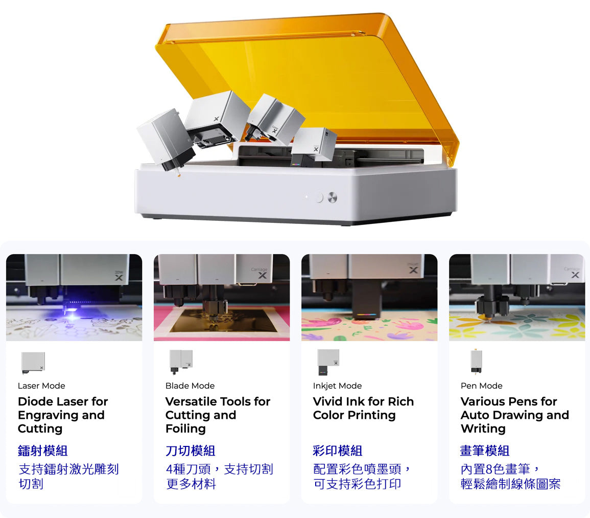 一機四用,一站式手工體驗:支持鐳射/刀切/彩色印刷/畫筆模組,能滿足所有創作需求!