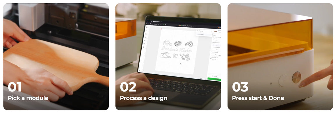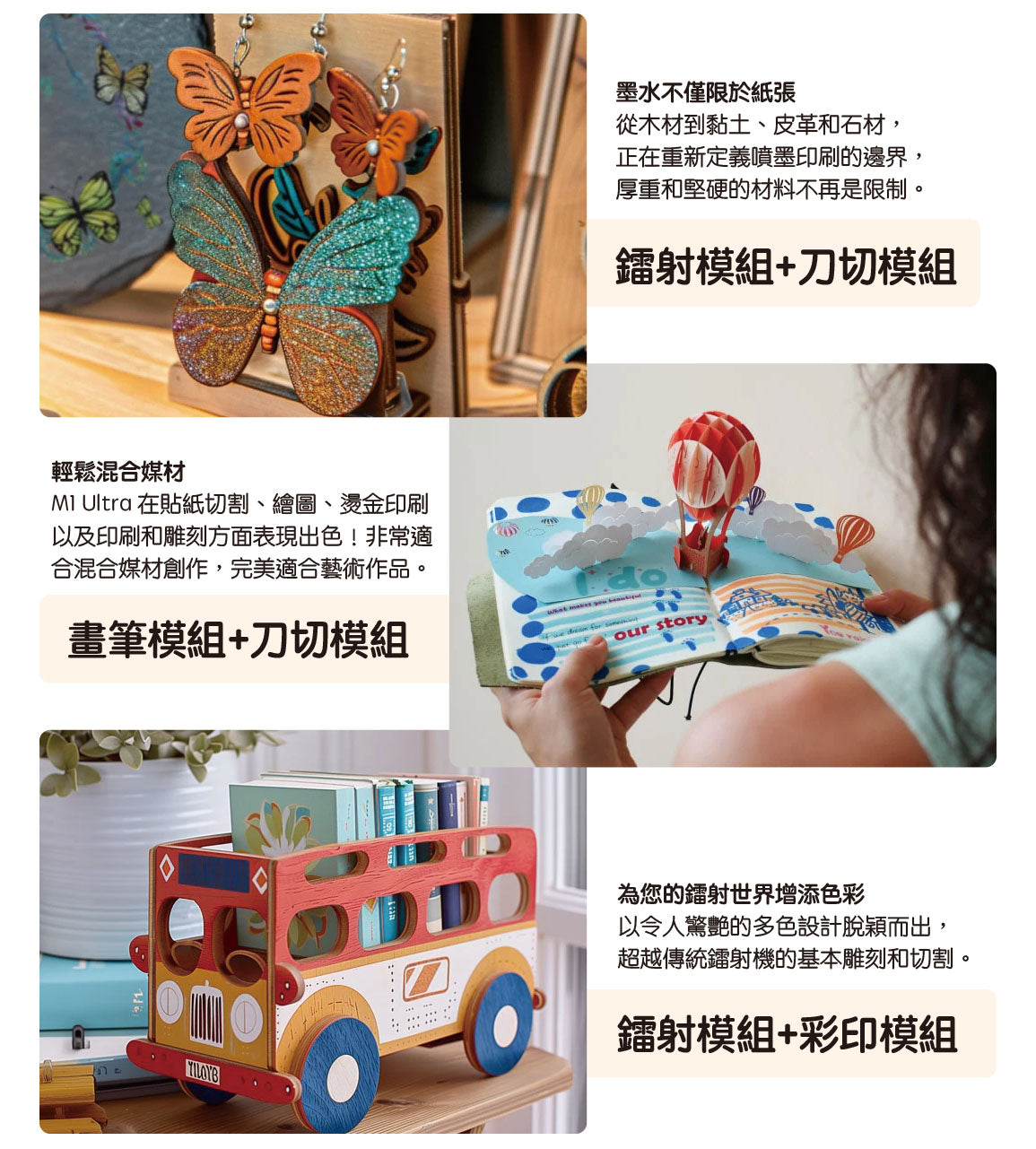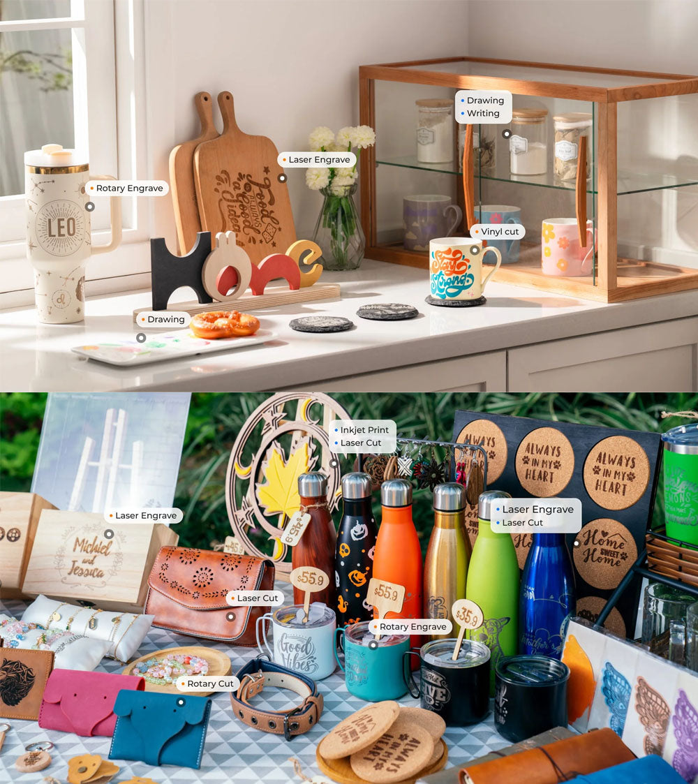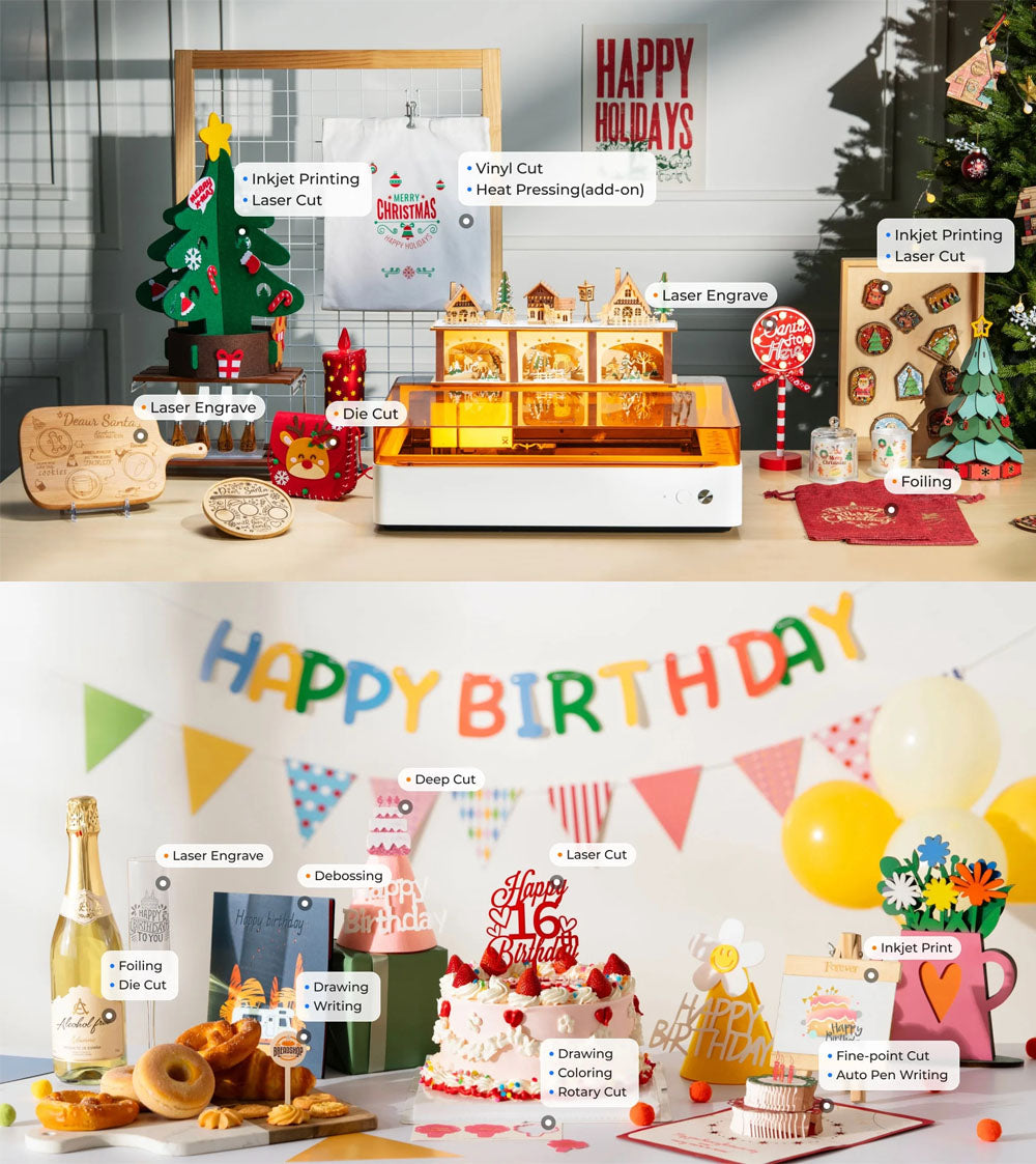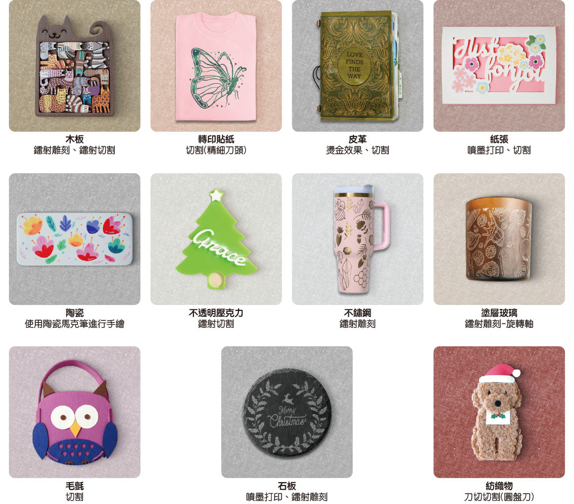 從軟到硬、從薄到厚、平面到3D曲面,M1 Ultra 專為滿足您的所有創作需求而設計。對材料兼容性是一般貼紙切割機或單一模式鐳射雕刻機的3倍,為您帶來無限的創作可能性。