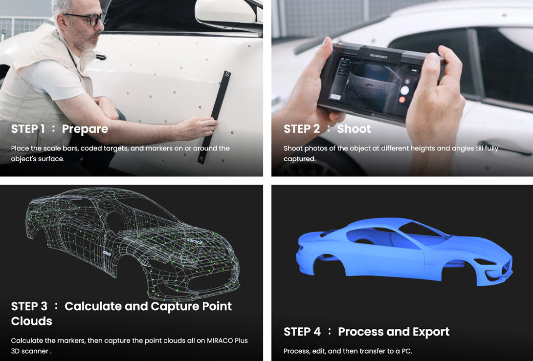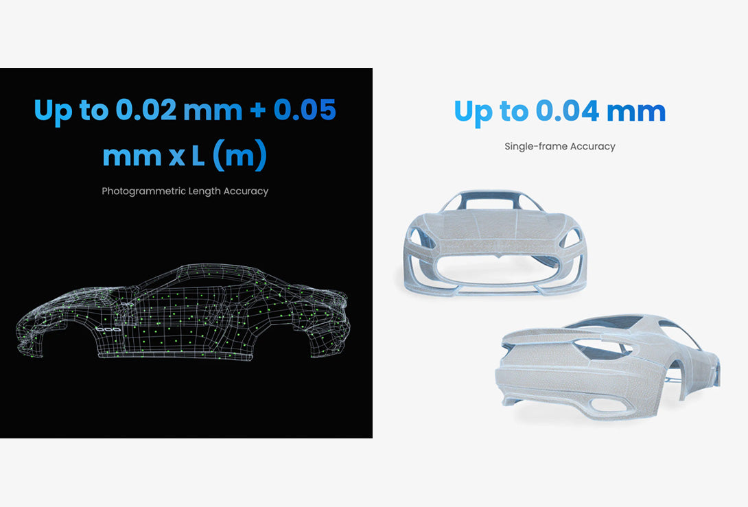 MIRACO Plus 透過高精準度的全域攝影測量套件,實現汽車、船舶、飛機及機械部件等大型物體的計量級準確捕捉,實現最高可達 0.02mm + 0.05mm × L(m) 的攝影測量距離精度。