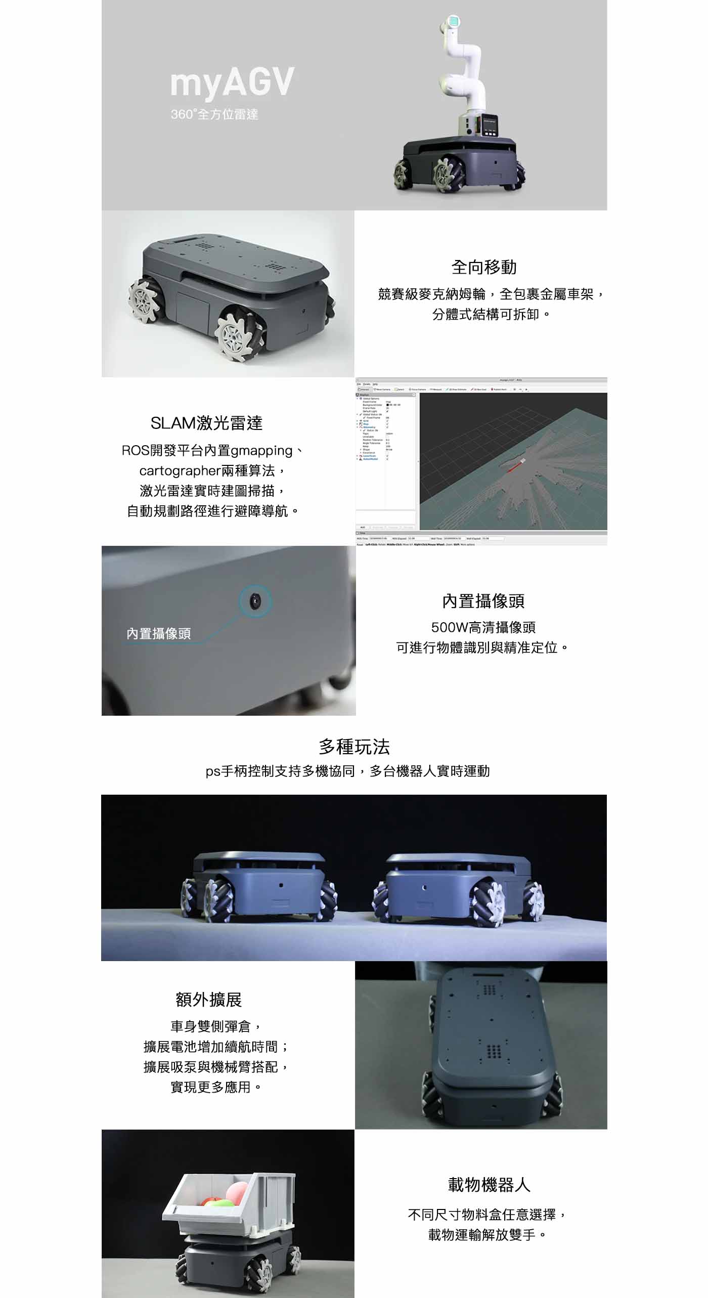 可搭載myCobot、mechArm、myPalletizer系列機械臂,實現移動抓取,擴展工作空間,使其能夠完成更多任務。