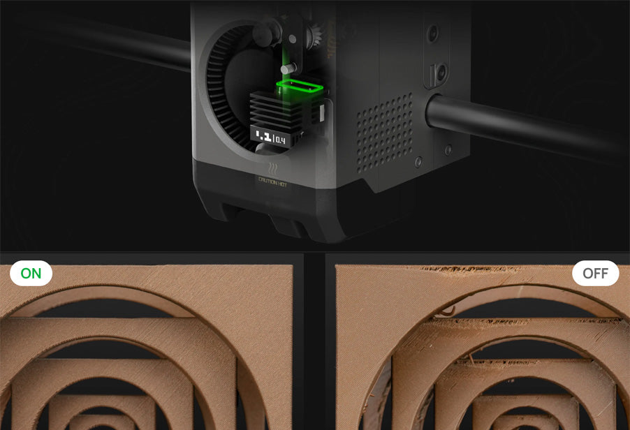 熱端最大流速:40 mm³/s (測試參數:單層外牆的 250 mm 圓形模型;拓竹 ABS;280 ℃ 列印溫度)