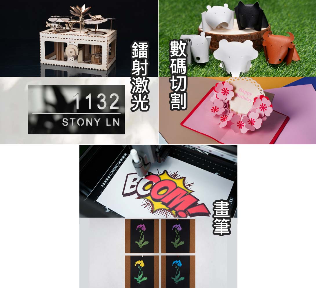 多功能四合一:雙噴頭3D打印、鐳射雕刻、模切、畫筆(*需選購鐳射套裝配合)