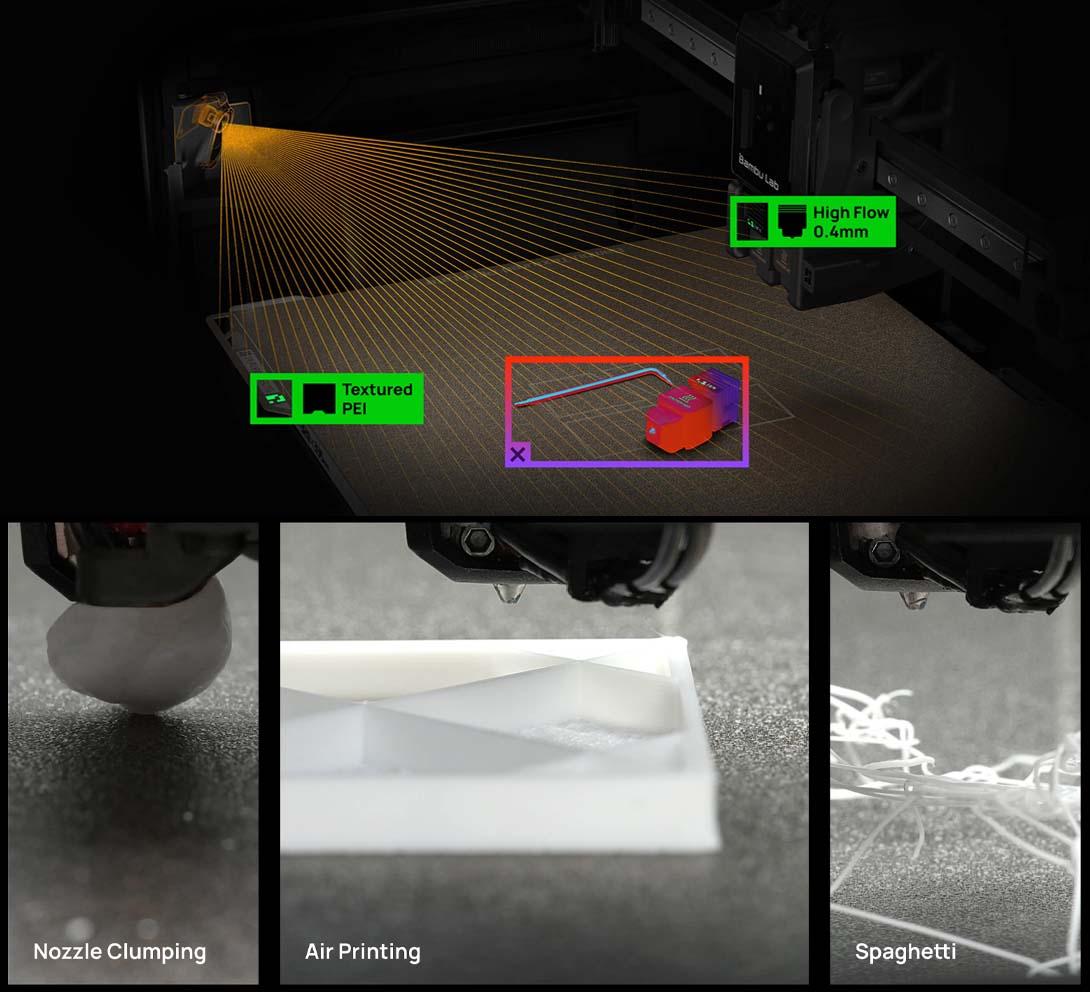 H2D 配備了帶微距鏡頭的 Al噴嘴攝像頭。智能監控系統持續跟蹤擠出狀態,即時檢測耗材堆積、耗材擠出偏差和擠出故障。