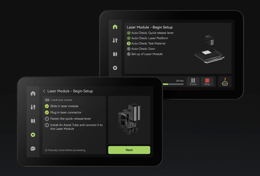 輕輕一點,即可啓動自動激光焦距驗證和材料識別,無需手動調整任何模塊,即可如實配置材料厚度、完成定位。