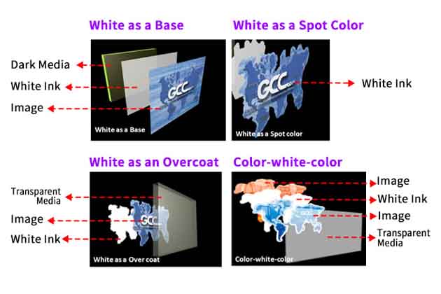 JF-240UV提供四種利用白墨的特殊應用:打底、上層塗布、特殊色和彩色-白色-彩色三個圖層同時輸出。白墨解決方案可以讓使用者在透明或者深色的底材上做不同的表現,提供絕佳的輸出品質,滿足標誌、包裝、禮贈品和客製商品等各行業需求。