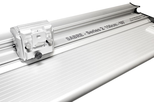 - Sabre Series 2 保證精度達1.0毫米(0.04英寸)。底座和切割桿底部的全長矽膠握條牢牢固定切割材料。內置基板具有公制平行凹槽和切割槽以確保精度。浮動自調鉸鏈自動調整,提供平鋪切割,適用於厚度達13毫米(1/2英寸)的材料,並將滑道保持在工作表面上方,便於重新定位材料。