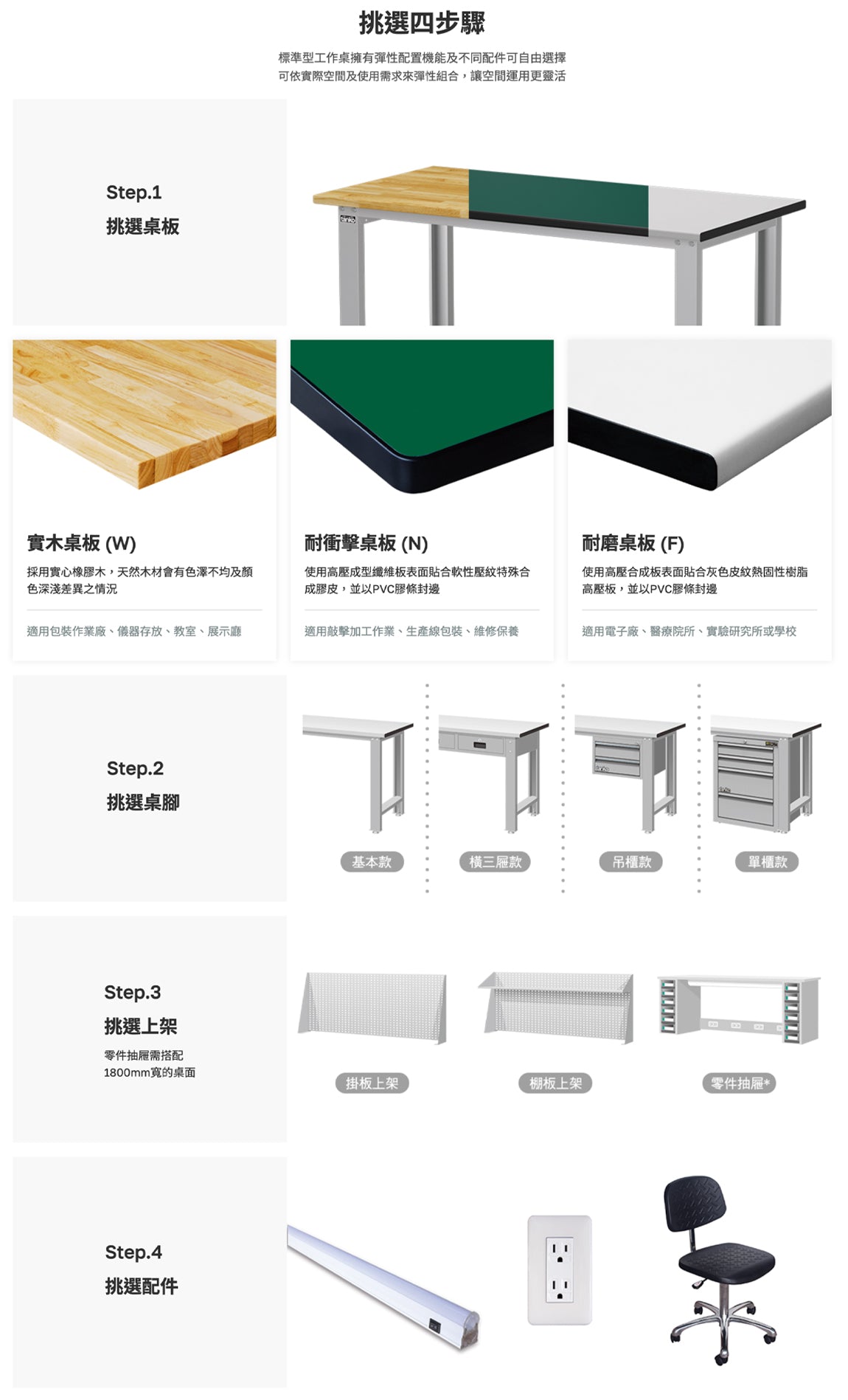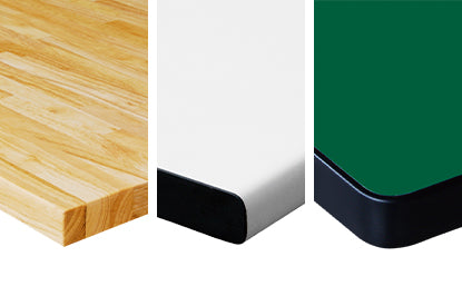 標準型工作桌有實心橡膠木、耐磨及耐衝擊三種桌板材質,可依不同作業用途自由挑選